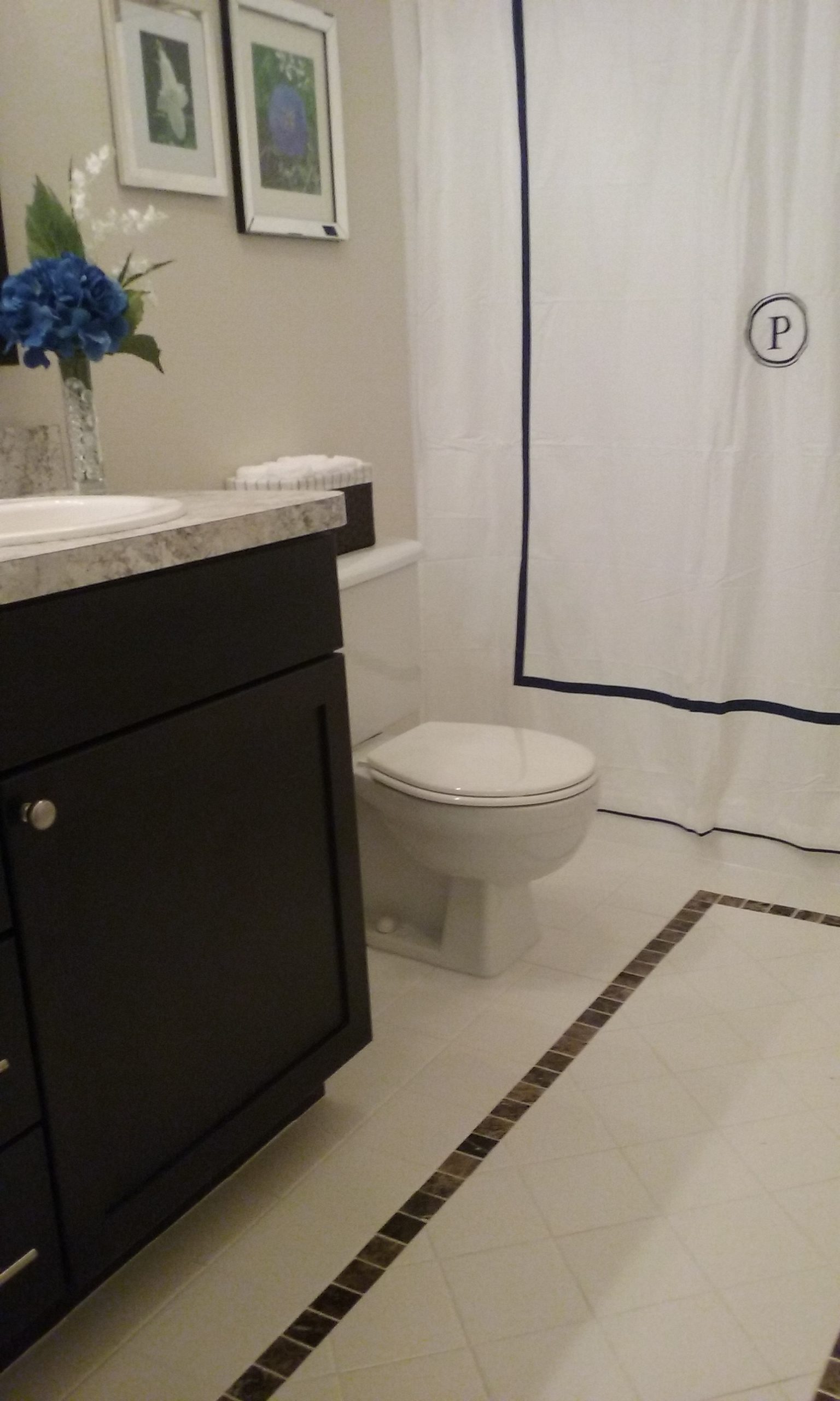 • Custom floor tile layout in bathrooms with inset detail in Emperador Marble
